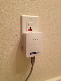 Next up is Ethernet over Powerline (HomePlug AV), a network that runs over your household's electrical wiring. This setup uses two devices that plug into your electrical outlets -- one near your ethernet router and one in the room without access. The system works okay. In my experience, you can expect 20-30% of ethernet speed. Because of split-phase wiring, it's very particular about where the two devices are placed and this network's speed will depend on good proximity.